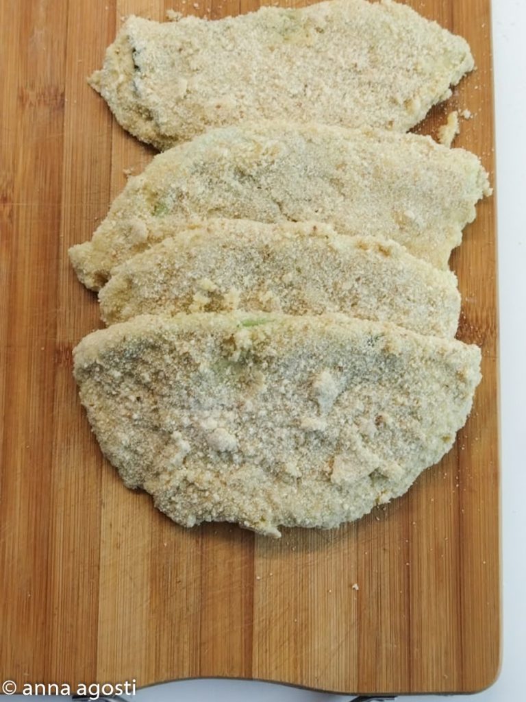 Drücken Sie gut, damit es von allen Seiten haftet. Wenn Sie eine noch knusprigere Panade wünschen, können Sie sie erneut in die Eier und dann in das Paniermehl tauchen.