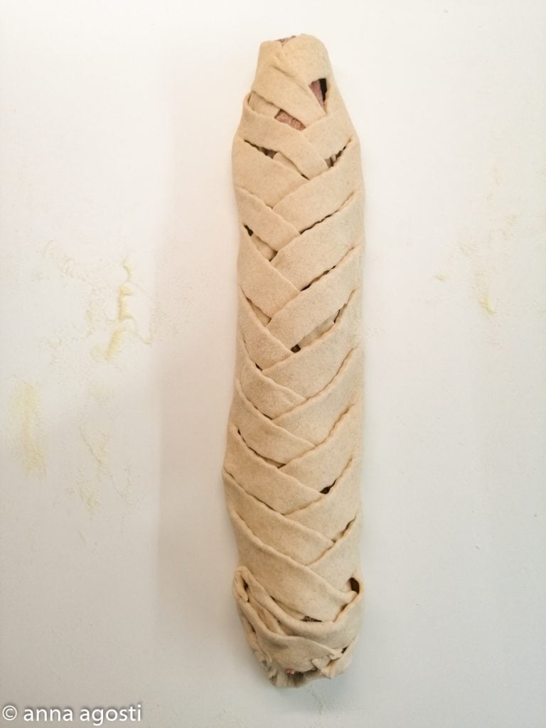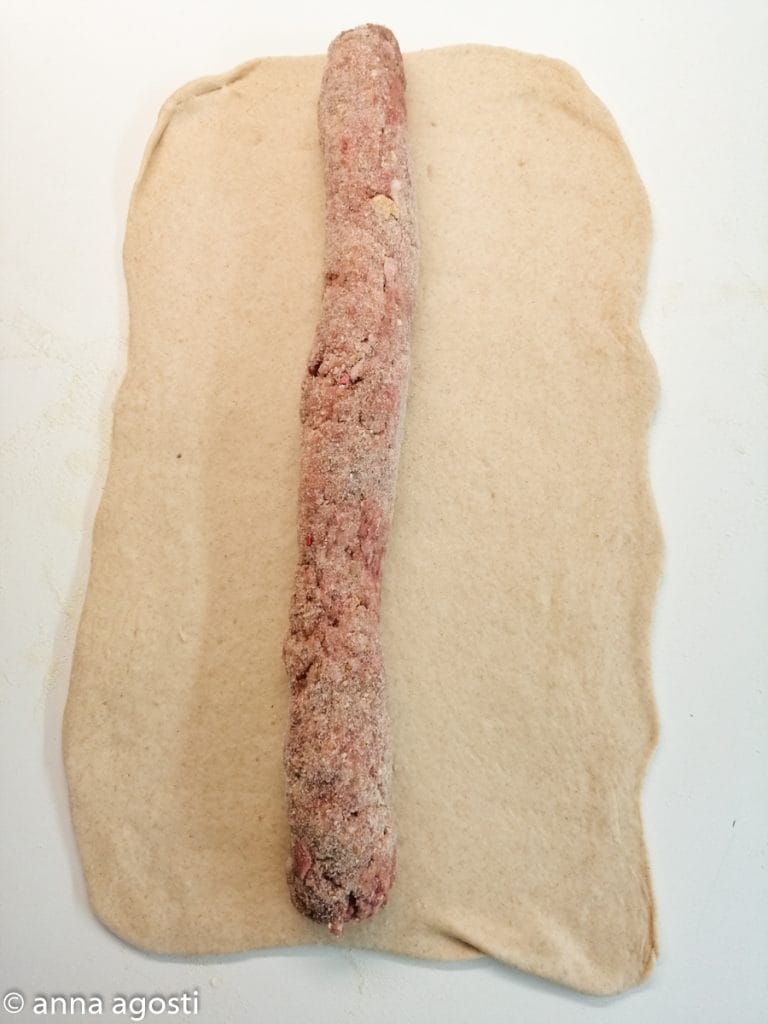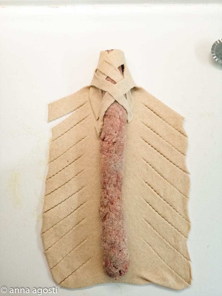 Ihr solltet einen Wurstzopf wie auf dem Foto erhalten, rollt ihn dann auf sich selbst.