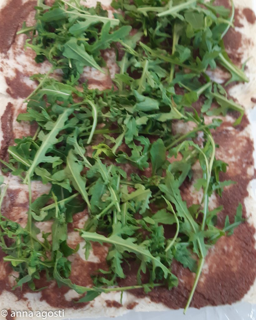 Verteilen Sie darüber den gut gewaschenen und getrockneten Rucola.