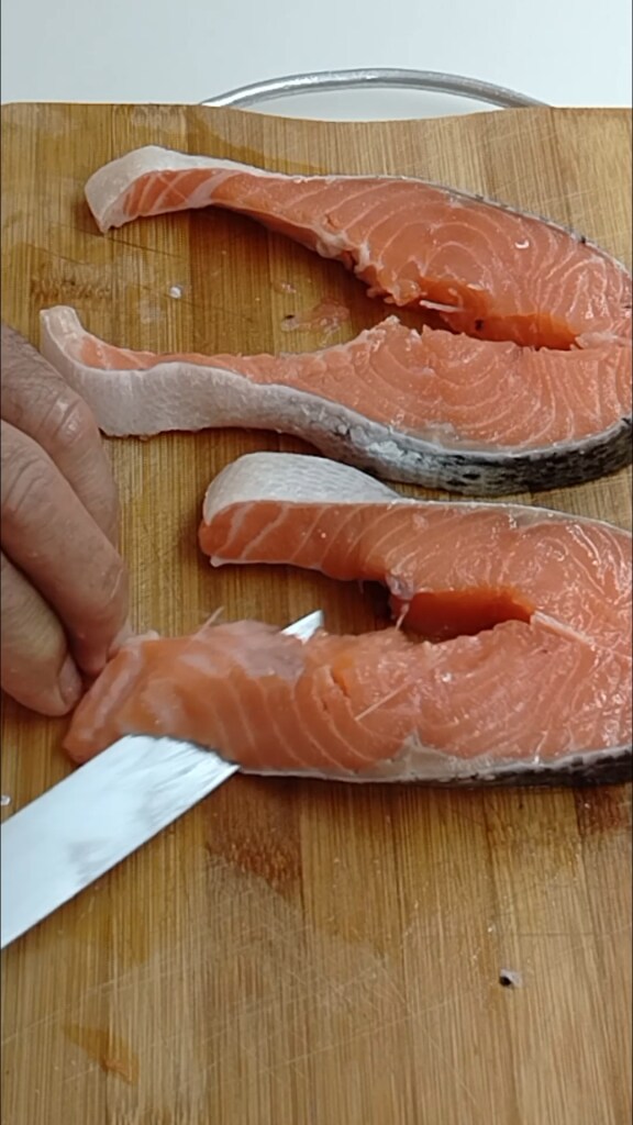 • In der Zwischenzeit entfernen Sie den zentralen Knochen der Lachsfilets und entfernen Sie mit einer Küchenpinzette eventuelle Gräten.