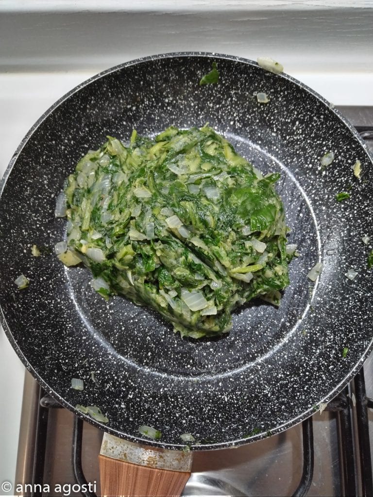 6- Pressen und hacken Sie den zuvor gekochten Mangold (Sie können auch gemischte Kräuter oder tiefgefrorenen Spinat verwenden).