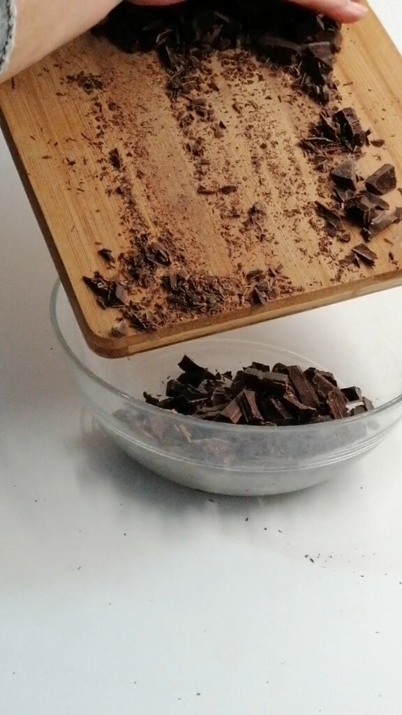 Um die Schokobecher zu machen, hacke zunächst die dunkle Schokolade.