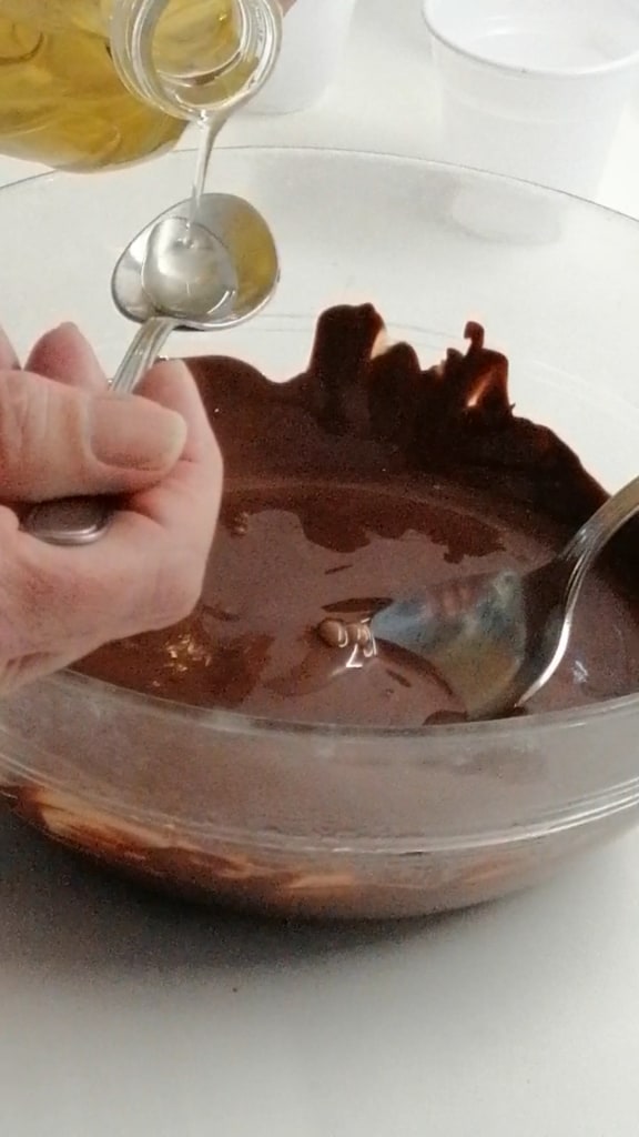 Lasse 2 Esslöffel geschmolzene Schokolade in die Becher fließen, indem du das Glas sehr langsam drehst, sodass es bis zum Rand gelangt.