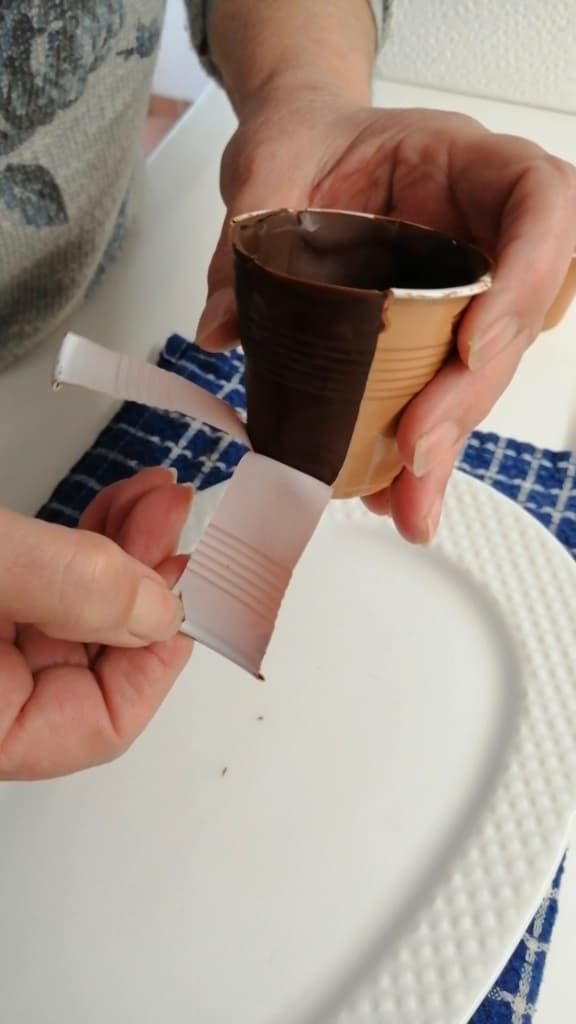 Ziehe vorsichtig, indem du den Rand des Bechers greifst und bei jedem Schnitt nach unten ziehst.
