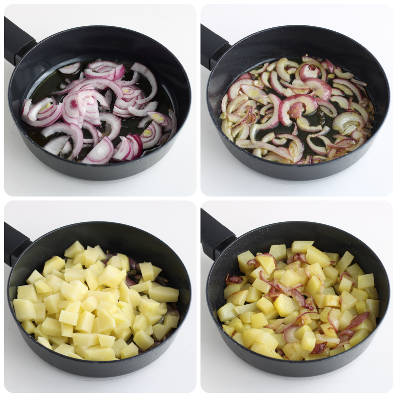 Erhitzt in einer großen Pfanne 4 Esslöffel Öl und gebt die in Scheiben geschnittene Zwiebel dazu, lasst sie ein paar Minuten weich werden.