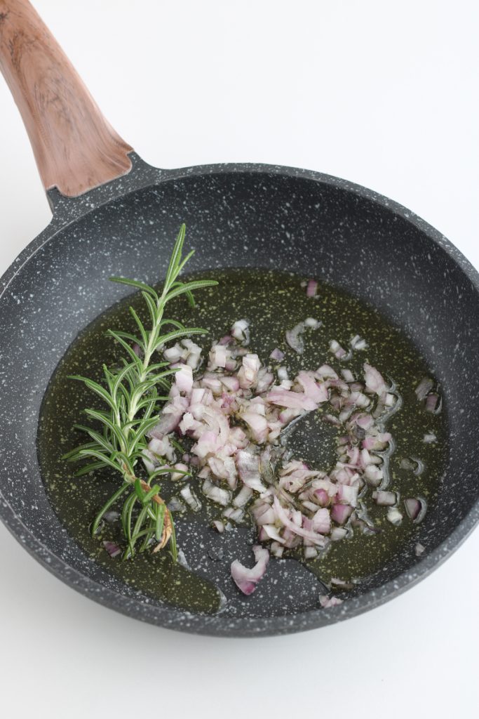 Geben Sie das geschnittene Gemüse in einen Topf mit kochendem Wasser und blanchieren Sie es für 5 Minuten.In einer Pfanne eine gehackte Zwiebel mit dem Öl und einem Zweig Rosmarin anbraten, dann den blanchierten Kürbis und den Rosenkohl hinzufügen und bei niedriger Flamme einige Minuten anbraten.