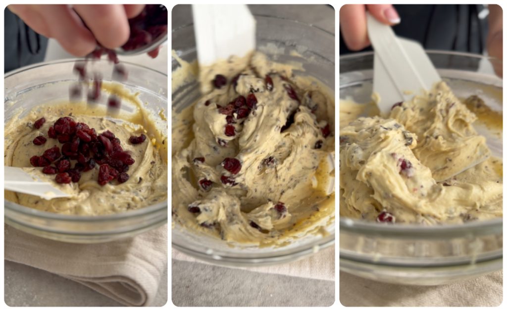 • Jetzt gebt ihr die getrockneten Cranberries dazu und vermischt sie gründlich, bis sie gut eingearbeitet sind.