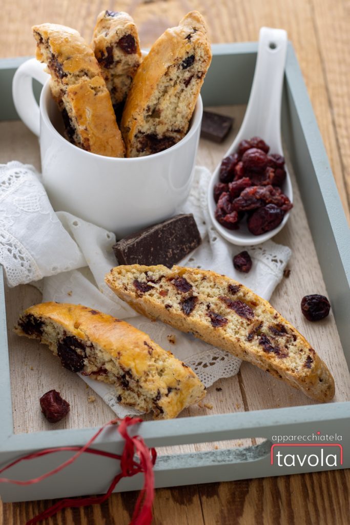 • Und so sind mit wenigen Zutaten und ohne Ruhezeit eure Cantucci mit Schokolade und Cranberries bereit zum Genießen. Perfekt sowohl zum Begleiten einer Tasse heißen Tees als auch als Abschluss eines Essens, zum Beispiel eingetaucht in ein Glas Vin Santo.