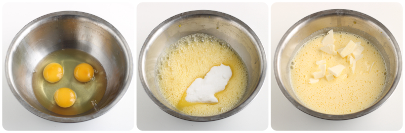 In einer Schüssel 3 ganze Eier aufschlagen und mit den elektrischen Schneebesen gut verquirlen, Zucker und die in Stücke geschnittene, weiche Butter zugeben.