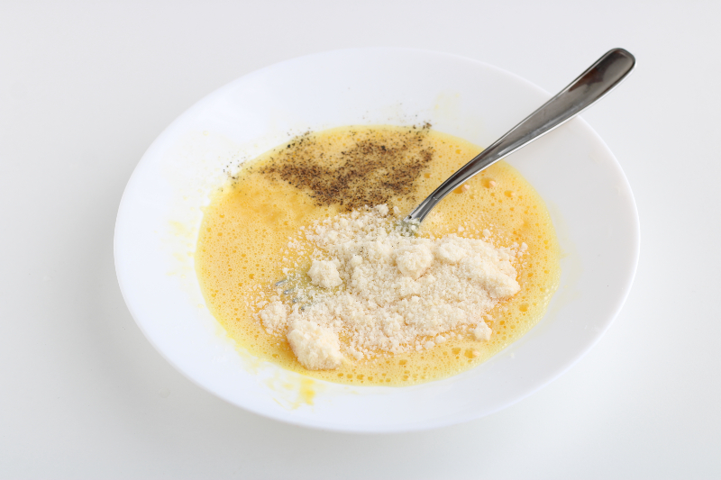Schlagen Sie die Eier in einem Teller gut auf, salzen, pfeffern und fügen Sie den geriebenen Parmesan hinzu.
