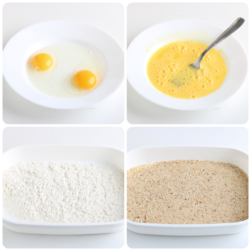 Bereiten Sie auch zwei Schalen zum Panieren vor: eine mit Mehl und eine mit Paniermehl. Jetzt sind Sie bereit, mit dem Panieren zu beginnen!