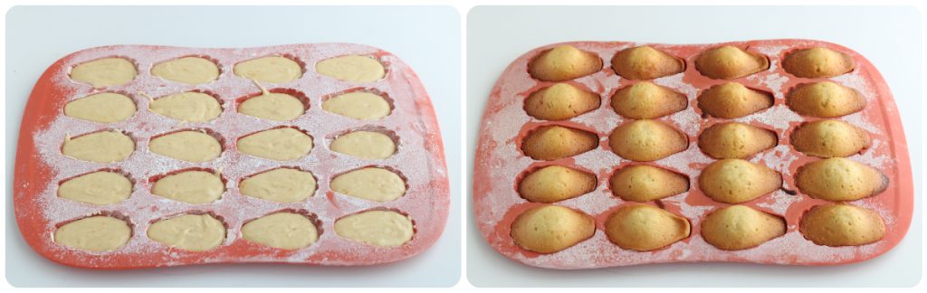 • Fetten und mehlen Sie eine Madeleine-Form sehr gut ein und füllen Sie jede Vertiefung zu 2/3 mit dem vorbereiteten Teig.