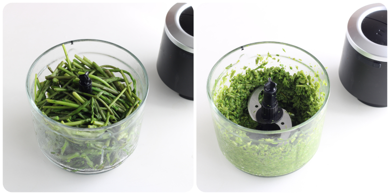 Sobald sie abgekühlt sind, püriert ihr die Spargelstangen sehr fein mit einem Küchenhacker (einige Stangen könnt ihr ganz lassen zur Dekoration).