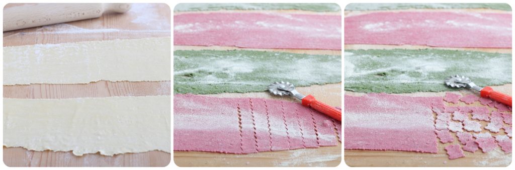 Wenn alle Teige bereit sind, schneidet mit Hilfe eines gezackten Teigrädchens kleine Quadrucci, nicht zu groß, von gleichmäßiger Größe (ca. 1,5 cm-2 cm pro Seite).