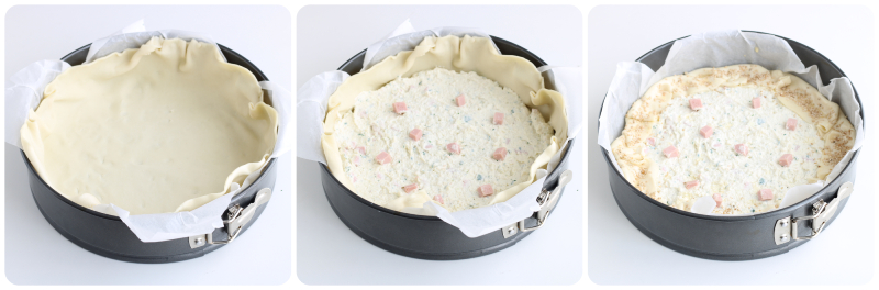 Füllen Sie den Boden mit der vorbereiteten Mischung aus Ricotta und Schinken und glätten Sie ihn an der Oberfläche, dann falten Sie den Teigrand darüber, bestreichen Sie ihn mit dem beiseite gestellten Ei und bestreuen Sie ihn mit Sesam.
