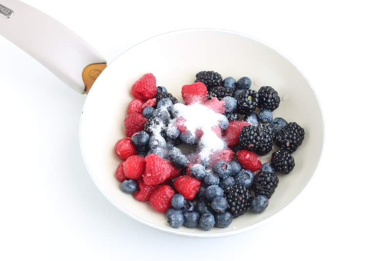 Bereiten Sie die Waldbeerensauce zu, indem Sie die Beeren mit einem Esslöffel Zucker in eine kleine Pfanne geben und 5 Minuten kochen. Pürieren Sie alles, bis Sie eine glatte Creme wie Marmelade erhalten (wenn Sie die Samen entfernen möchten, filtern Sie einfach die Sauce).
