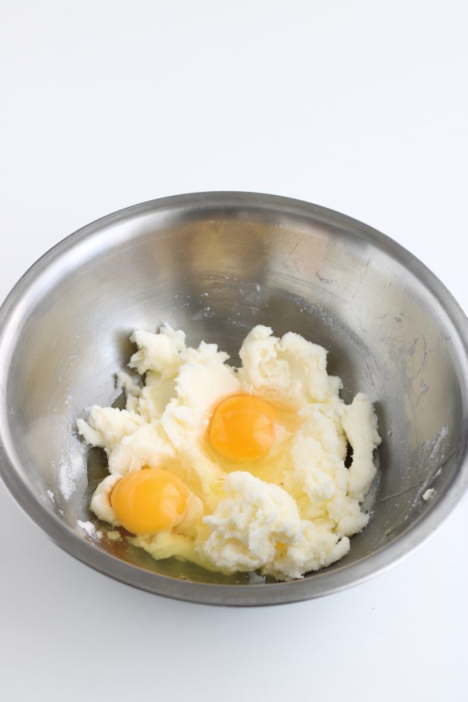 Die Eier dazugeben und rühren, dann das gesiebte Mehl hinzufügen und weiter kneten.