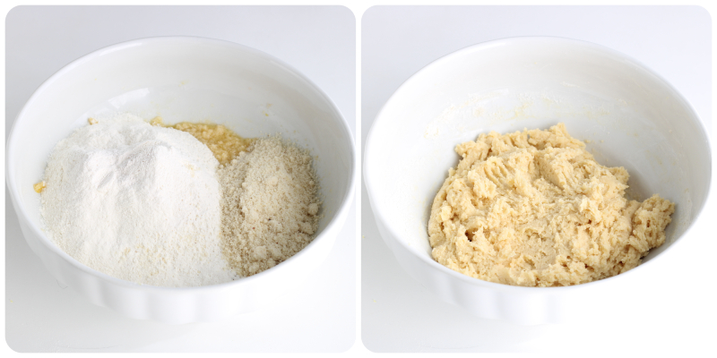 Das gesiebte Mehl, das Mandelmehl, das Backpulver und eine Prise Salz hinzufügen, dann mischen, bis ein weicher, aber formbarer Teig entsteht. Lassen Sie ihn 15 Minuten im Kühlschrank ruhen, abgedeckt mit Frischhaltefolie.