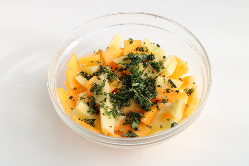 Geben Sie den Kürbis und die Kartoffeln in eine Schüssel, sprühen Sie etwas Olivenöl darüber, salzen und pfeffern Sie.