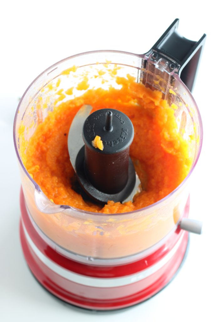 Während der Teig im Kühlschrank ruht, bereiten Sie die Füllung vor: Geben Sie den gebackenen Kürbis in einen Mixer, pürieren Sie ihn zu einem Brei und geben Sie ihn in einen kleinen Topf.