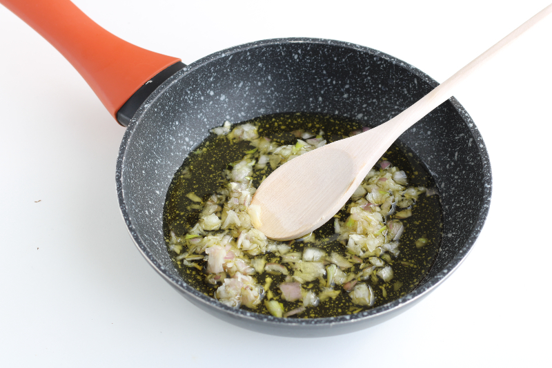 Die Schalotte fein hacken und in einer Pfanne mit dem Öl anbraten, sobald sie zu bräunen beginnt, die Zucchini und die geschnittenen Pilze hinzufügen.