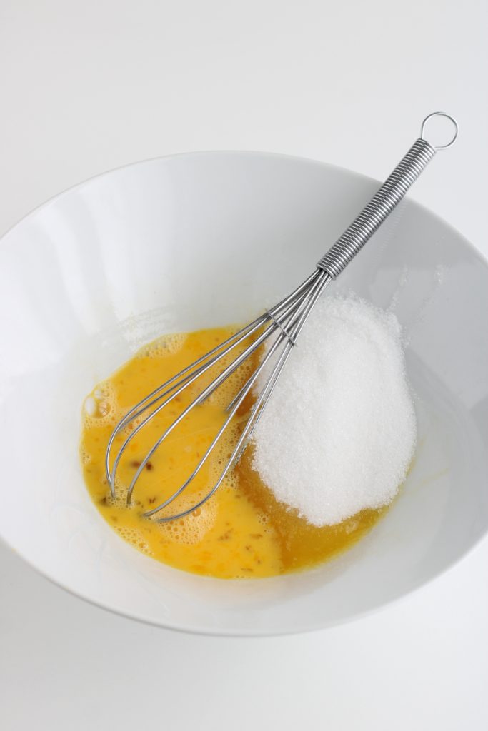 In einer Schüssel 2 Eier schlagen und mit dem Zucker und dem Ricotta aufschlagen.