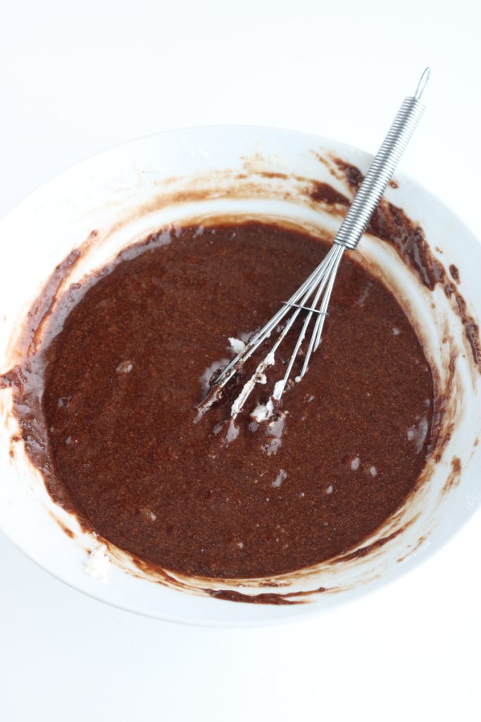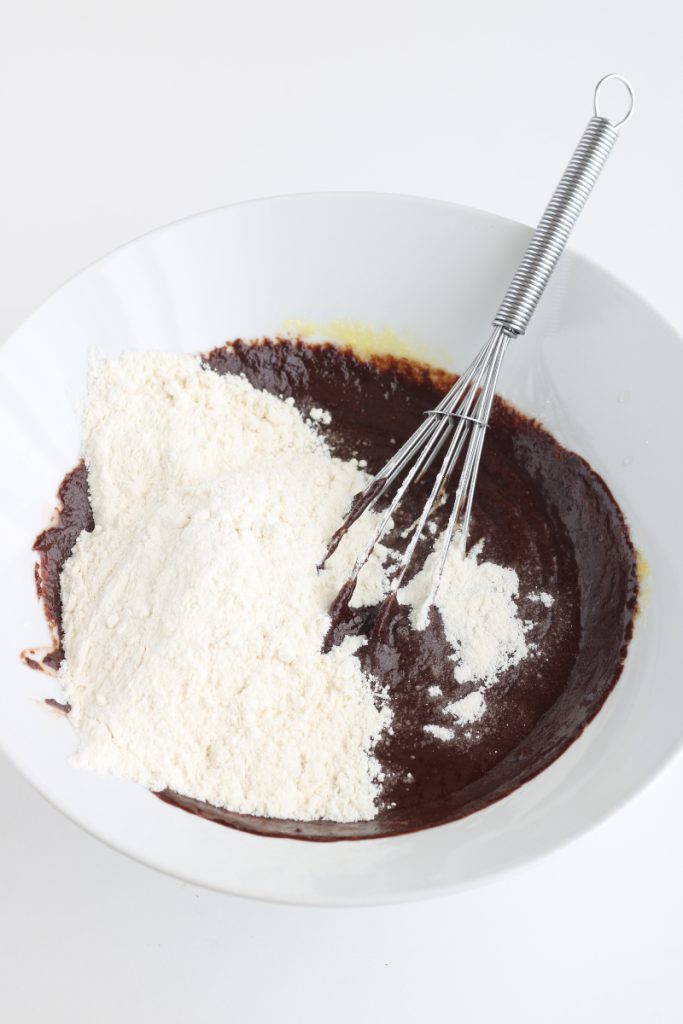 Fügen Sie dem Teig das gesiebte Mehl hinzu und rühren Sie erneut.