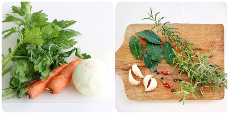 Schneiden Sie das Wildschwein in Stücke und legen Sie es in eine Schüssel zusammen mit einer Karotte, der Zwiebel und dem Sellerie in Scheiben. Fügen Sie auch 1 Zweig Rosmarin, 3 Lorbeerblätter, zwei Knoblauchzehen und eine Handvoll Wacholderbeeren hinzu (diese sind sehr wichtig, da sie helfen, den starken Geschmack des Wildfleisches zu entfernen).