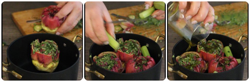 Die Zubereitung ist ganz einfachEinfach Petersilie, Pancetta und Knoblauch fein hacken – und fertig ist die Mischung. Ein kleiner Tipp: sucht euch einen passenden Topf, sowohl in der Höhe als auch in der Breite, damit die Artischocken beim Garen gut aufrecht stehen.