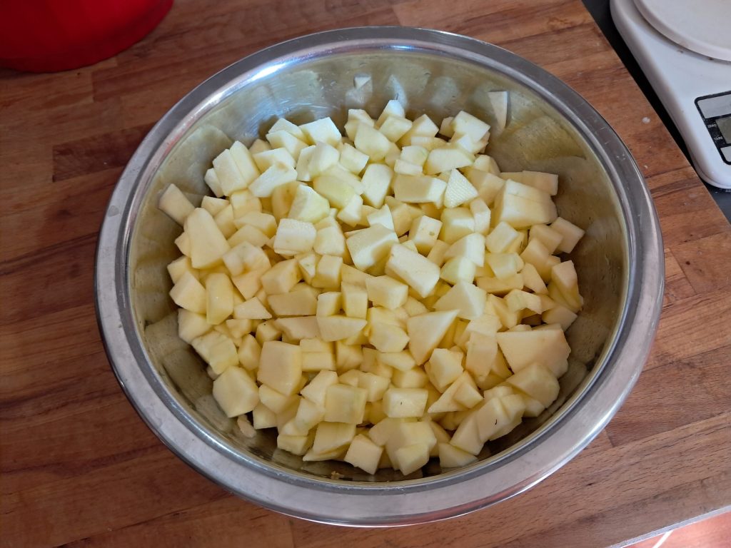 Schälen Sie die Äpfel, entfernen Sie das Kerngehäuse, schneiden Sie sie in Würfel von etwa 1 cm und legen Sie sie in eine Schüssel.