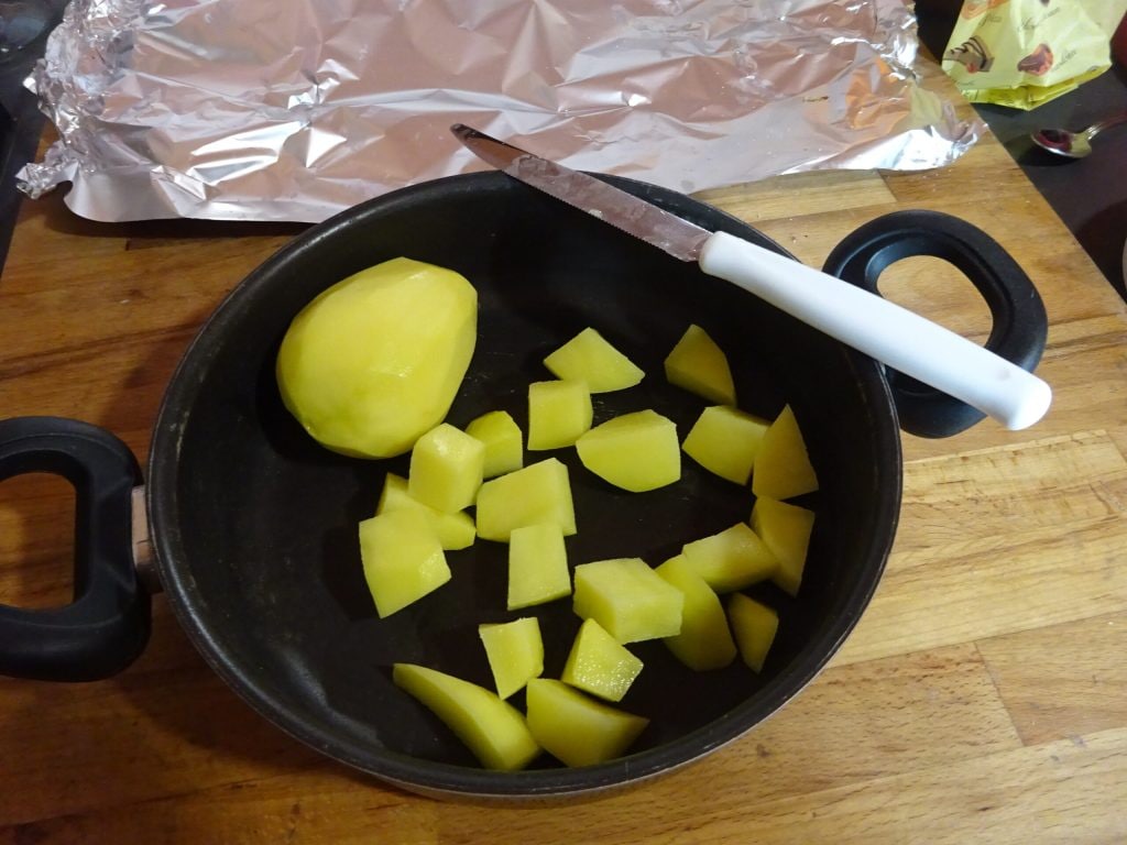 • Schneiden Sie die bereits gekochten oder gedämpften und fast vollständig abgekühlten Kartoffeln in Stücke von ca. eineinhalb Zentimetern.