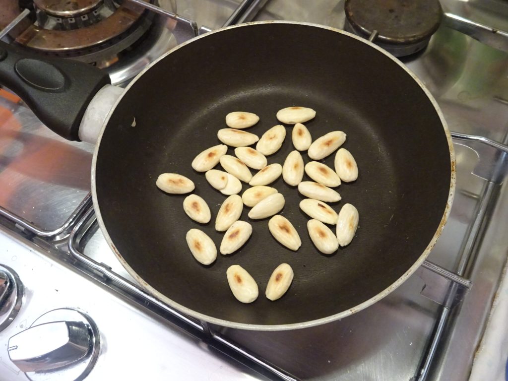 Zuerst die geschälten Mandeln in eine antihaftbeschichtete Pfanne geben und ohne Öl leicht auf beiden Seiten rösten. Es dauert etwa 4/5 Minuten bei mittlerer bis niedriger Hitze.