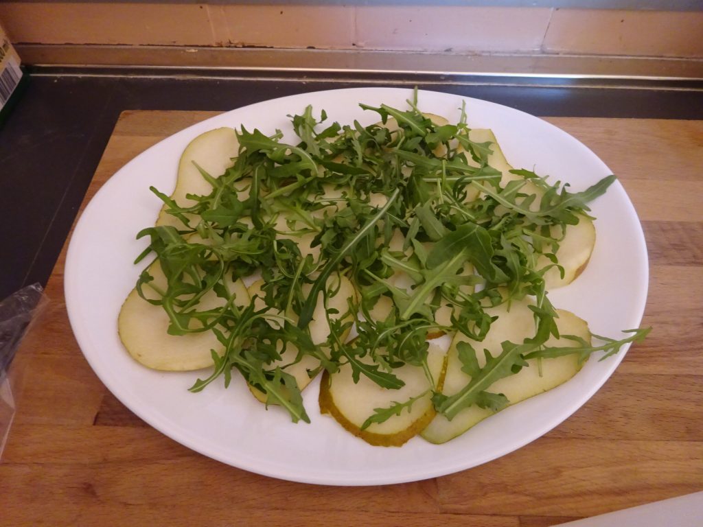 Dann die Birnenscheiben auf Serviertellern anrichten und mit frischem Rucola bestreuen.