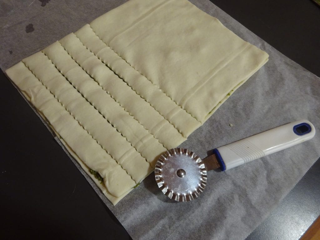 • Jetzt den Blätterteig wie ein Buch zusammenklappen und mit einem gezahnten Rädchen die Grissini aus dem Teig schneiden, etwa 1 cm breit. Mit dieser Größe erhält man 10 oder 11 Stück.