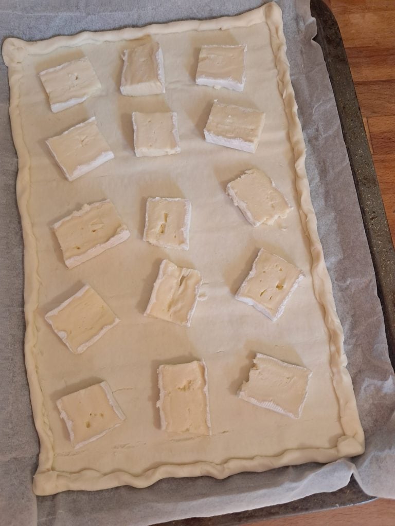 • Schneiden Sie dann den Brie-Käse in Scheiben von etwa einem halben Zentimeter und legen Sie ihn auf den Blätterteig.