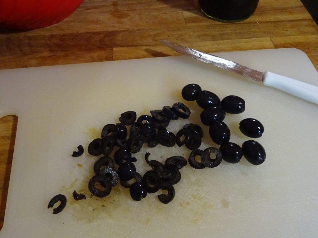 Wenn Sie keine griechischen Oliven finden, wie es mir passiert ist, entscheiden Sie sich für eine andere Sorte, aber immer schwarze Oliven.