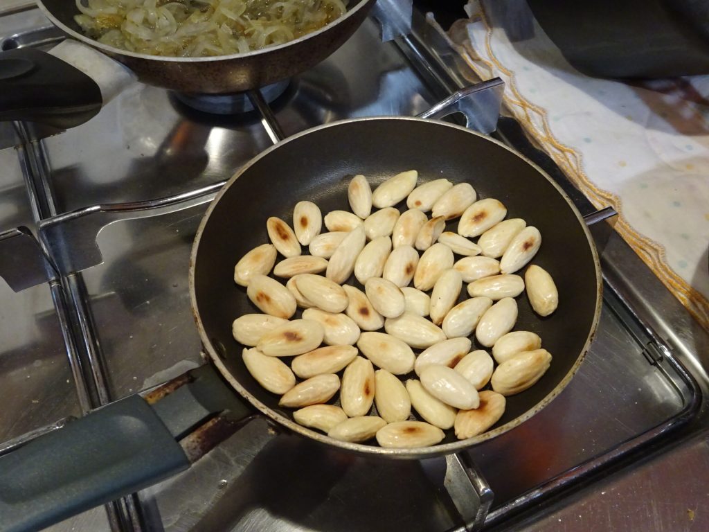 …die gerösteten Mandeln grob hacken, wobei einige für die Dekoration ganz gelassen werden.