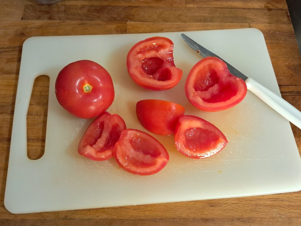 In der Zwischenzeit die Tomaten gut waschen, dann halbieren oder vierteln und die Kerne entfernen.