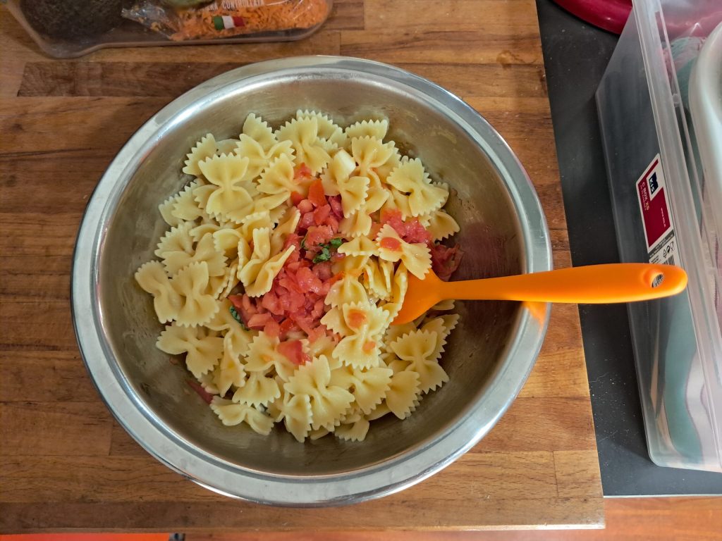 Wenn die Pasta gekocht ist, gut abtropfen lassen und in die Schüssel mit den gewürzten Tomaten geben.