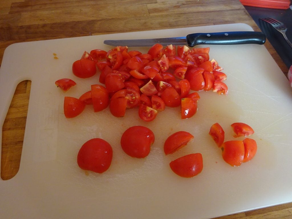 In der Zwischenzeit die Kirschtomaten waschen, halbieren und jede Hälfte in vier Teile schneiden.