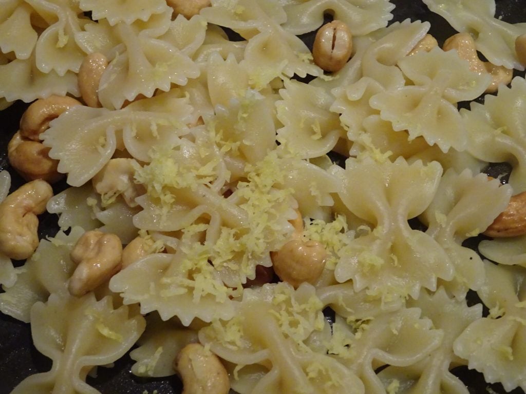 Wenn die Farfalle fast gar sind, ca. 2 Minuten davor, abgießen und direkt in die Pfanne mit den Cashewkernen geben.