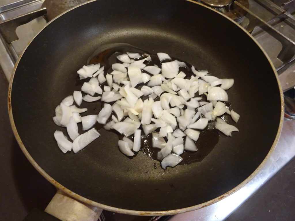 Die Zwiebel in ziemlich dünne Stücke schneiden und bei niedriger Hitze mit 2 Esslöffeln Olivenöl etwa 5 Minuten anbraten.