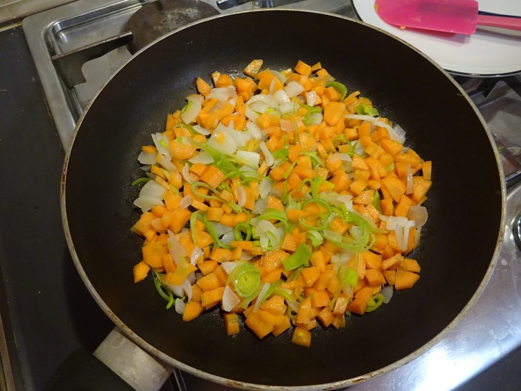 Nun die Karotten in Würfel schneiden und 5 Minuten kochen.