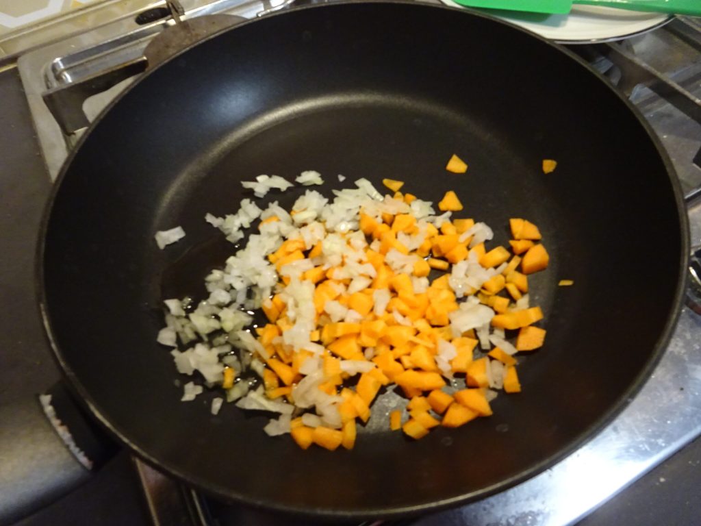 Reinigen und in kleine Würfel schneiden: eine Karotte und eine halbe Zwiebel. Sobald sie geschnitten sind, geben Sie das Gemüse in eine Pfanne mit einem Esslöffel Olivenöl, 1 Prise feinem Salz und einem Esslöffel kaltem Wasser. 5 Minuten bei mittlerer bis niedriger Hitze kochen.
