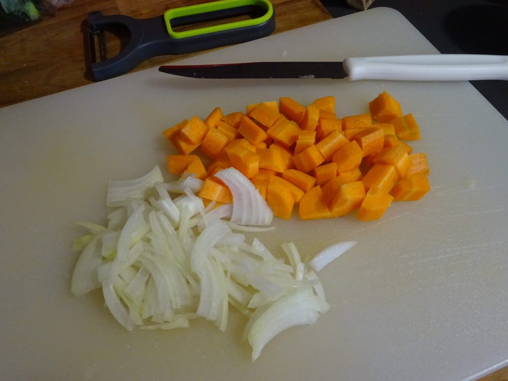 In der Zwischenzeit die restliche halbe Zwiebel in Julienne-Streifen und die zweite Karotte in circa 1 Zentimeter große Stücke schneiden.