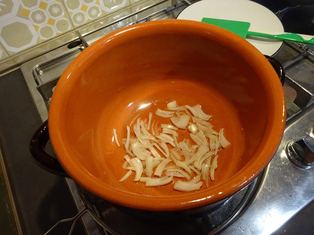 In einem Tontopf 1 Esslöffel Öl und die Zwiebel hinzufügen. Bei niedriger Hitze auf den Herd stellen und 5 Minuten ohne Deckel anbraten.
