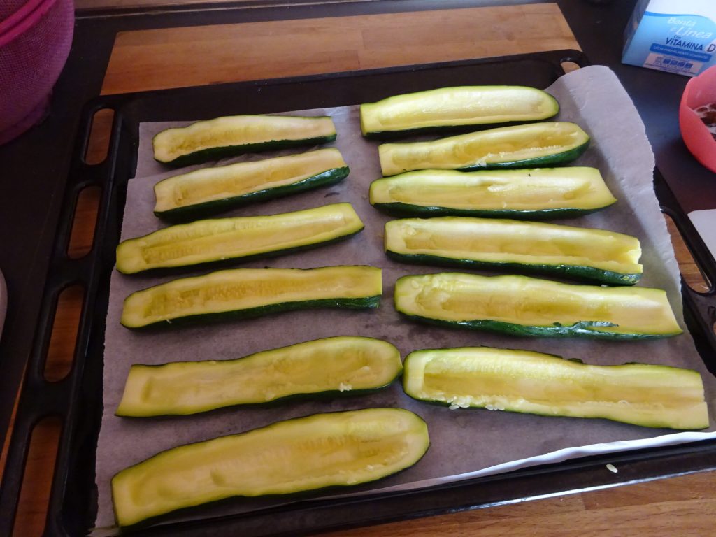 Dann auf ein mit Backpapier ausgelegtes Blech legen, längs halbieren und mit einem Teelöffel aushöhlen, dabei darauf achten, den Boden nicht zu durchstoßen.