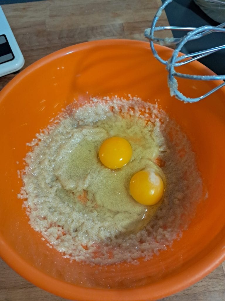 In eine Schüssel die leicht geschmolzene Butter geben, dann den braunen Zucker hinzufügen und mit dem Mixer rühren, bis eine homogene Masse entsteht.