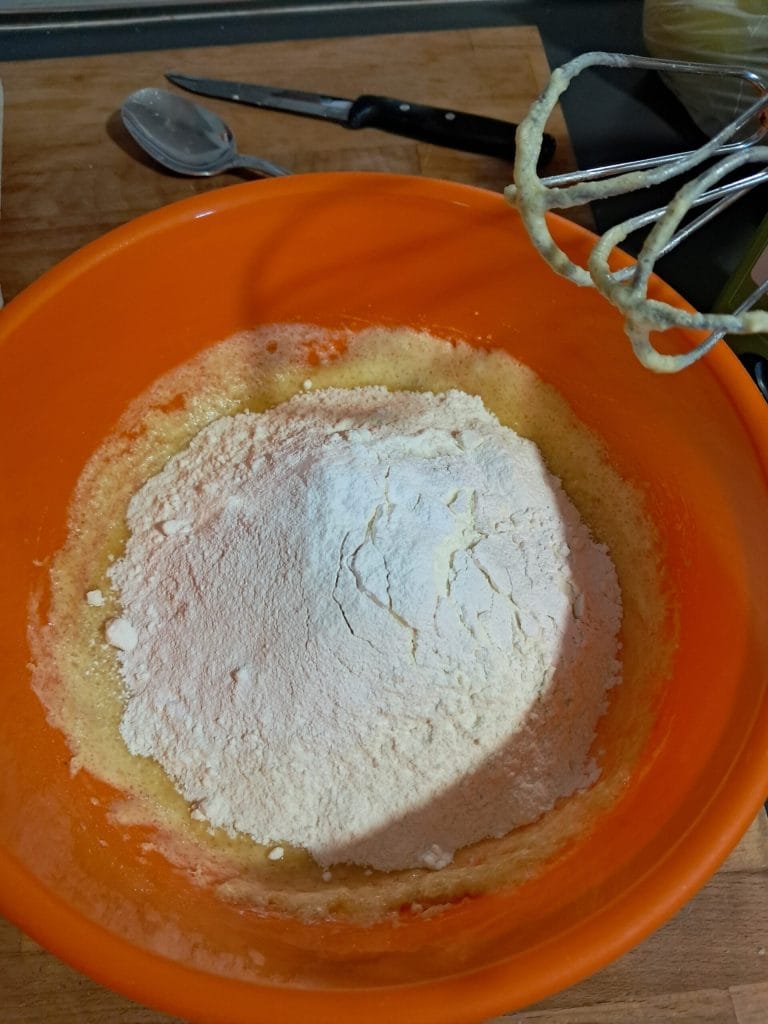 Sobald die Eier eingearbeitet sind, das Weizenmehl 00, das Backpulver, eine Prise feines Salz hinzufügen und alles gut vermischen.