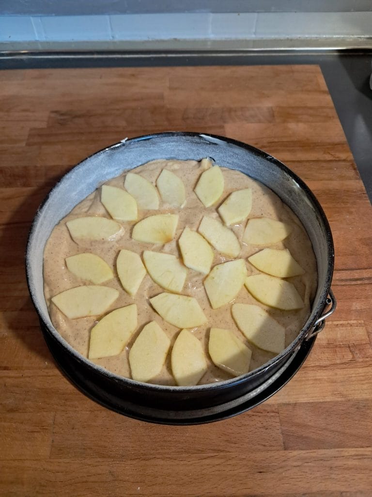 Dann eine Springform von 26 cm einfetten und mehlen und die Masse mit den Äpfeln hineingeben. Schließlich mit den beiseitegelegten Apfelscheiben dekorieren.